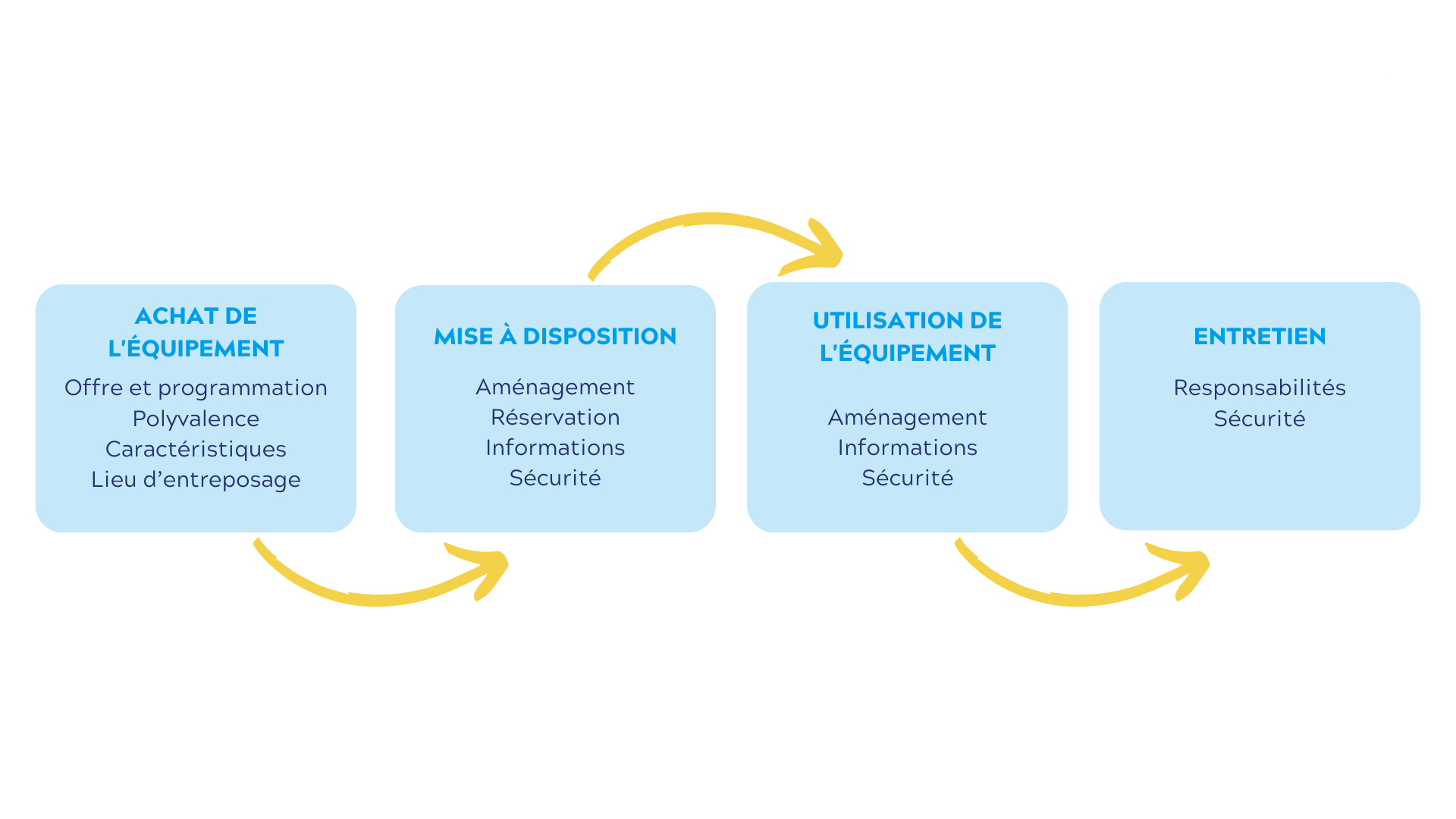 Lorsque l’achat d’un équipement est à prévoir, il est essentiel de réfléchir, entre autres, à sa mise à disposition, à son utilisation, à son entreposage et à son entretien afin d’assurer son usage, sa pérennité et la sécurité des personnes utilisatrices. Lorsque l’équipement est rendu disponible, il est important d’avoir du personnel formé pour expliquer son fonctionnement et évaluer sa conformité.